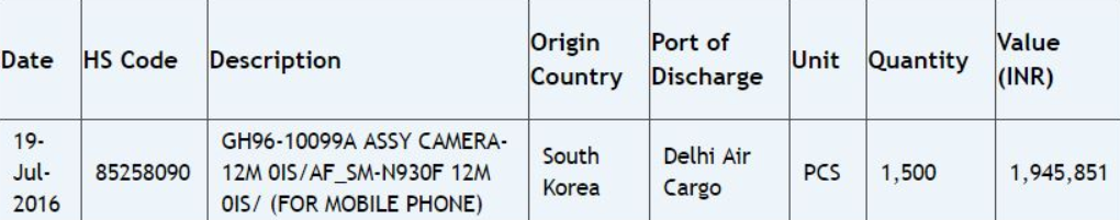 Ahora parece que Zauba ha confirmado un nuevo componente clave del teléfono. Se cree que el Samsung Galaxy Note 7 llegará con la misma cámara de 12MP del Galaxy S7, ya que un módulo de cámara de 12MP ha llegado a India para el SM-N930F procedente de Corea del Sur.