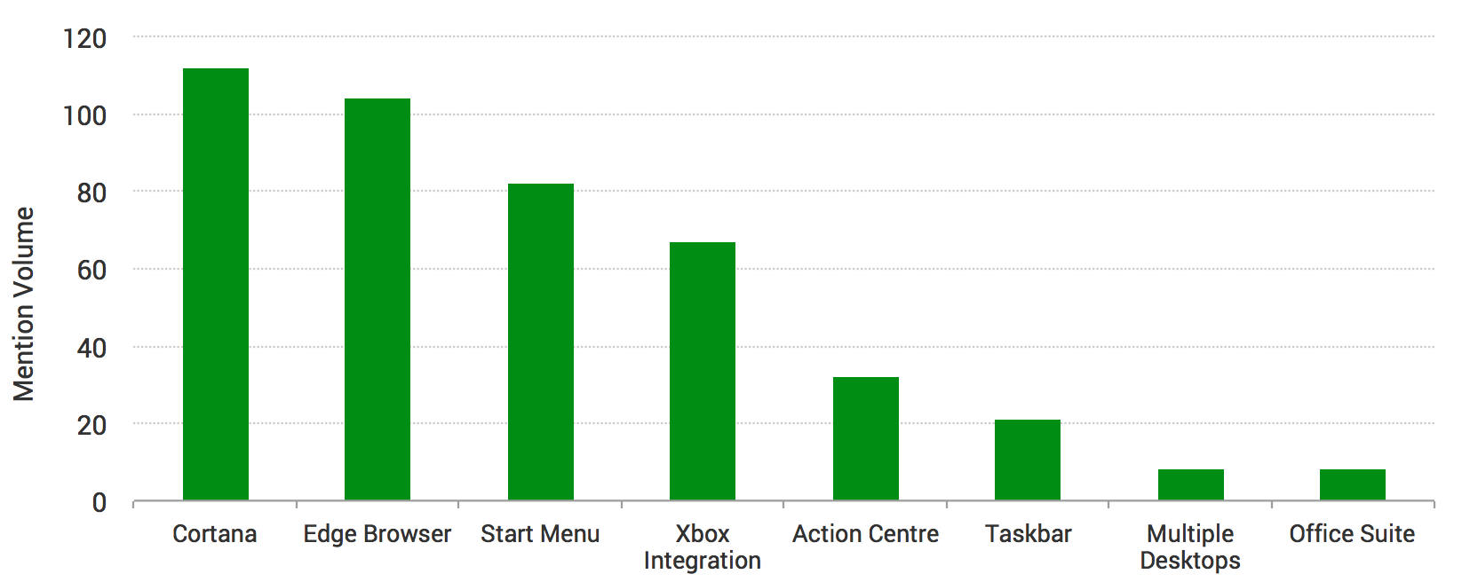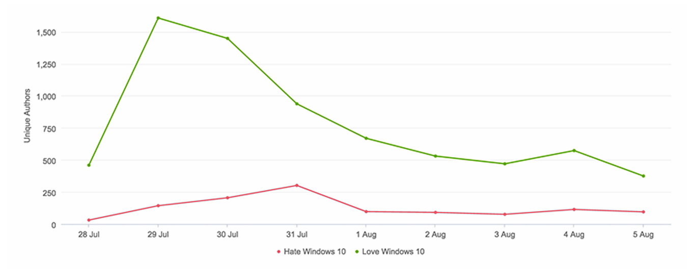 En el día de lanzamiento, los «amantes» de Windows 10 superaron a los que «odian» el nuevo sistema operativo en una proporción de 10 a 1. A lo largo de los siguientes días, las cosas empeoraron un poco para Microsoft, pero el sentimiento general siguió siendo muy positivo: el 86% de la gente mostraba su «amor» hacia el nuevo sistema operativo mientras que el 14% mostró su «odio.»