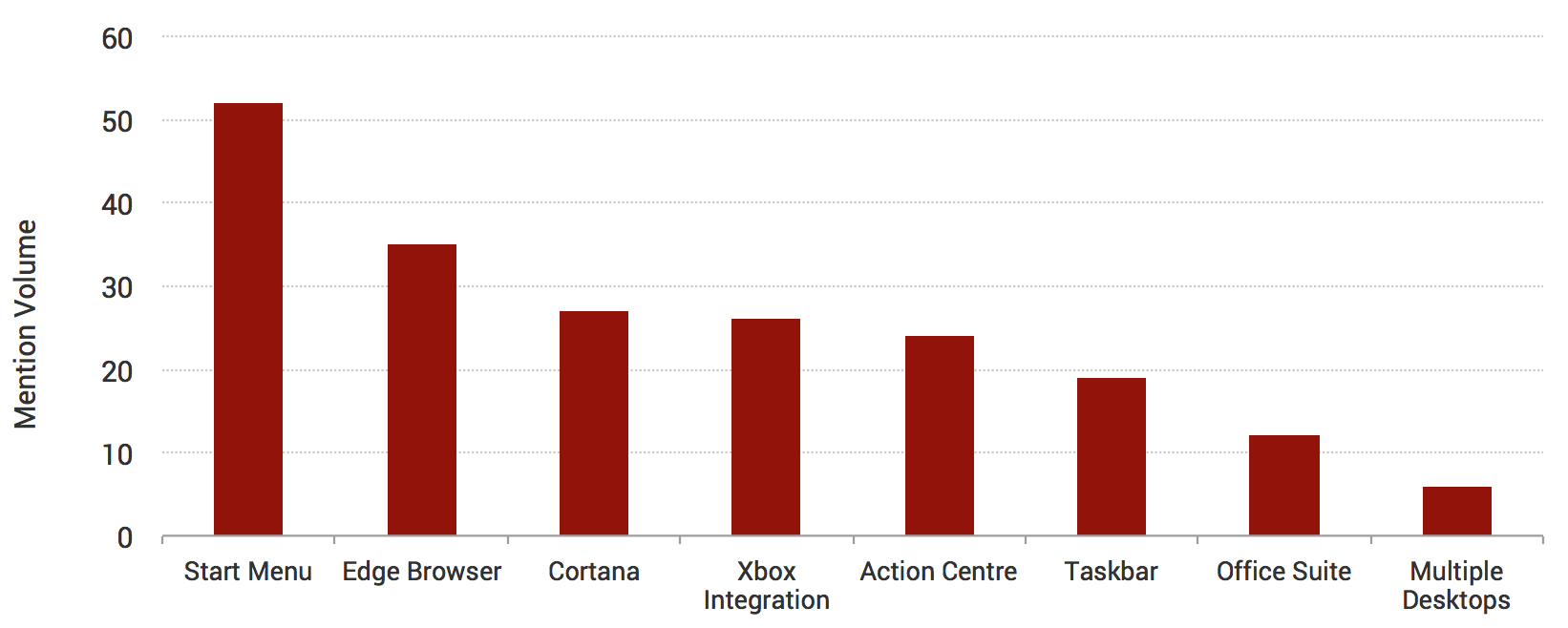 La siguiente gráfica muestra los términos más nombrados en aquellos mensajes negativos hacia Windows 10. Parece que el menú Inicio no acaba de convencer a los usuarios, y tampoco el navegador Edge goza de demasiada popularidad.