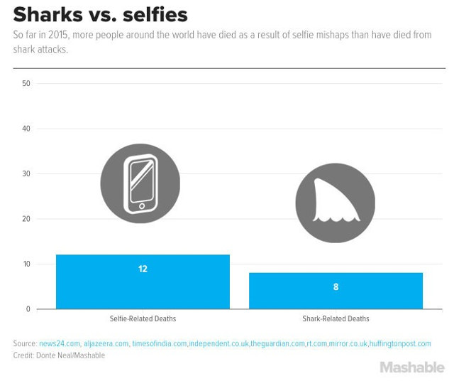 En concreto, en 2015 han muerto 12 personas haciéndose un selfie y solo 8 personas por ataque de tiburón, según la información recopilada por los chicos de Mashable de diversas fuentes como news.com, aljazeera.com, timesofindia.com, independent.co.uk, theguardian.com, rt.com, mirror.co.uk, huffingtonpost.com.
