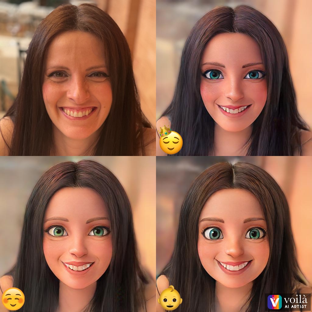 A continuación, puedes ver algunos ejemplos de la aplicación de Voila AI en acción. Para cada foto, genera tres imágenes: Royalty, Baby y Cartoon. Algunos resultados son mejores que otros pero, en general, es divertido.