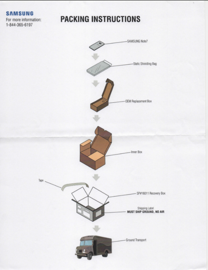 Tal y como Samsung advierte, esta caja solamente es apta para el transporte terrestre. El kit llega con guantes especiales de seguridad ya que algunas personas pueden ser sensibles al material de la caja de recuperación.