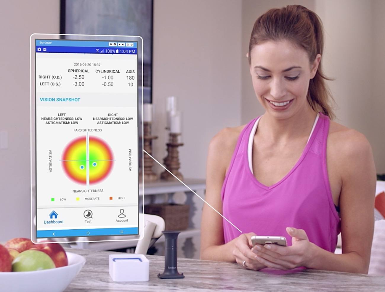 El equipo de EyeQue ha desarrollado un pequeño dispositivo óptico y una app para smartphone basada en una patente del MIT.