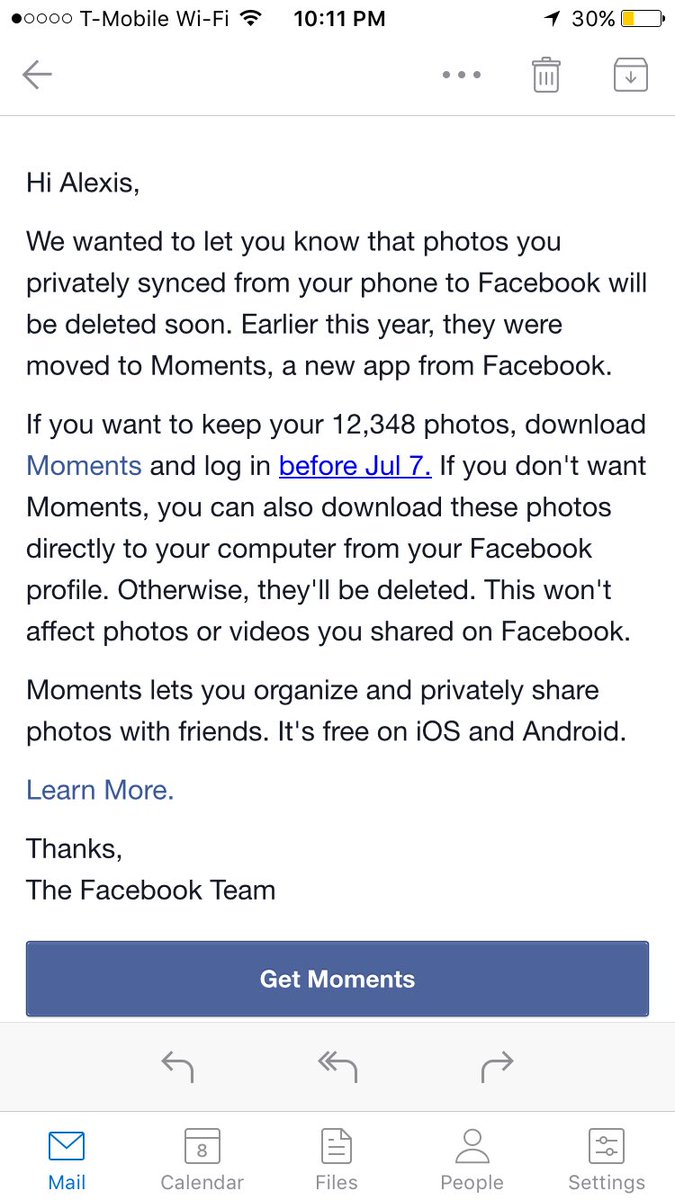 Si has utilizado la funcionalidad de auto-sincronización de Facebook, tienes hasta el 7 de julio para pasarte a Moments o descargar un fichero ZIP con tus fotografías. Si no lo haces, tus recuerdos desaparecerán.