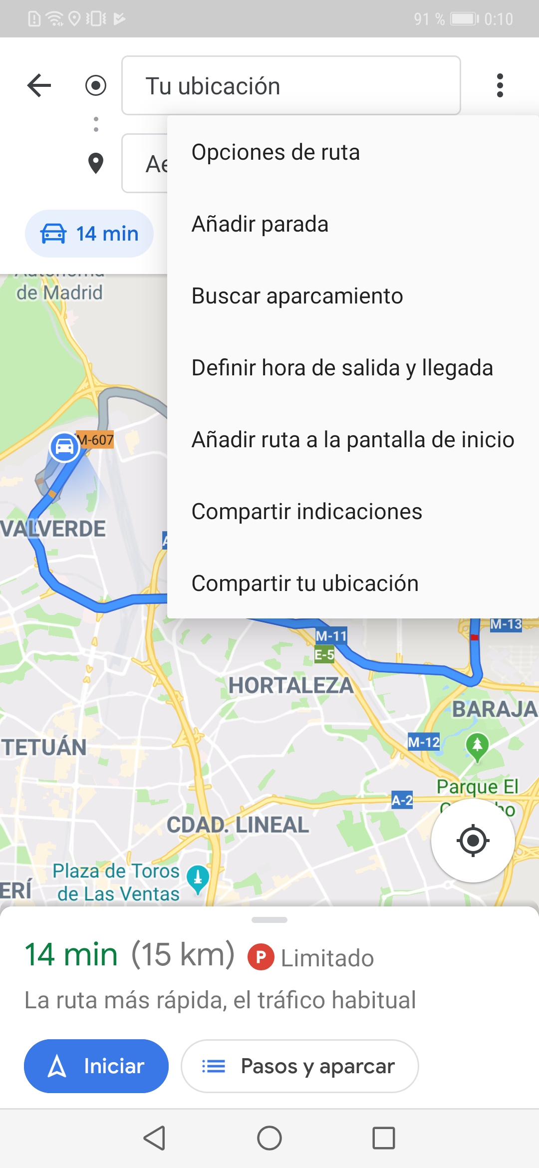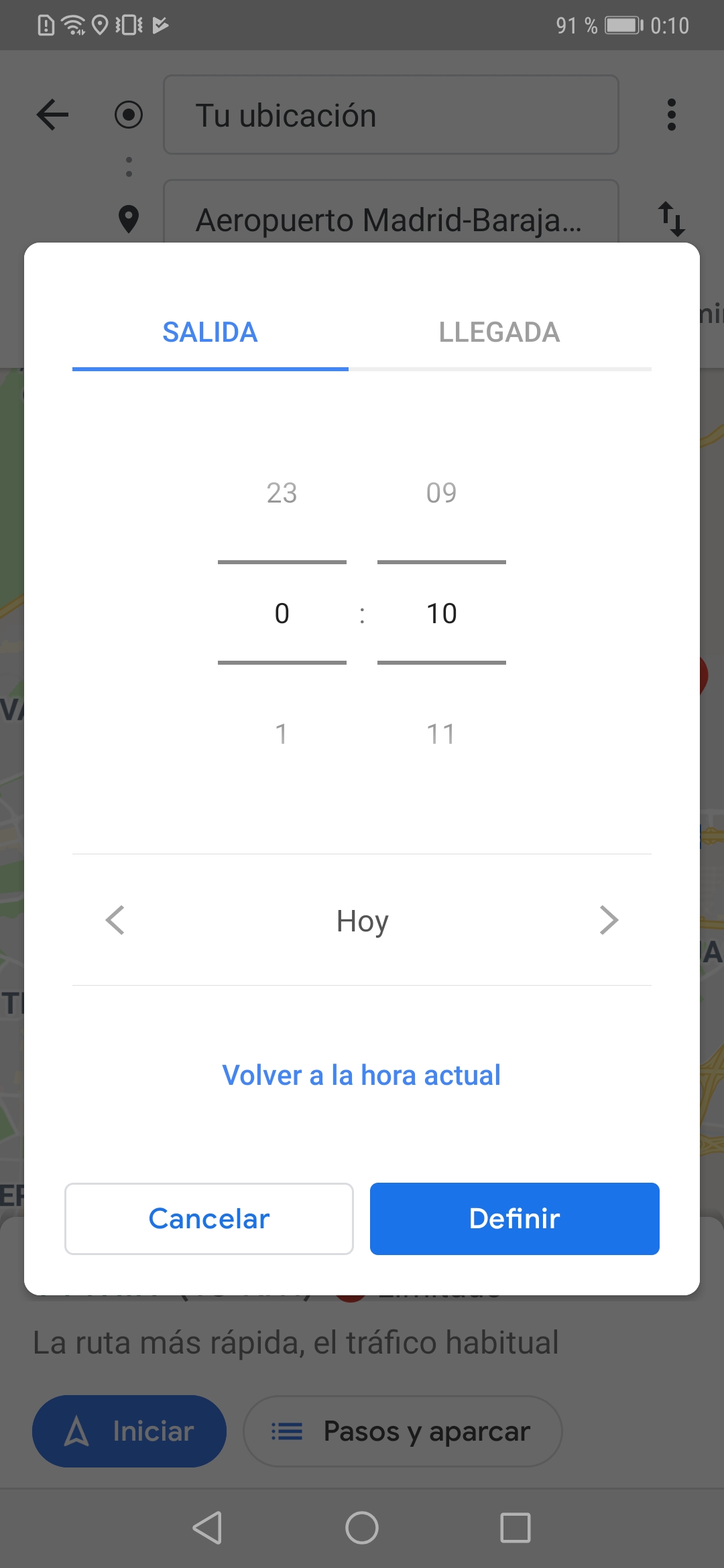 Por suerte, la última versión de la app para Android añade una opción llamada “Definir hora de salida y llegada.” Puedes indicar cualquier fecha y hora para obtener una estimación de lo que tardarás en tu desplazamiento y cuándo llegarás (si has establecido la hora de salida) o cuándo deberías salir (si has establecido la hora de llegada).