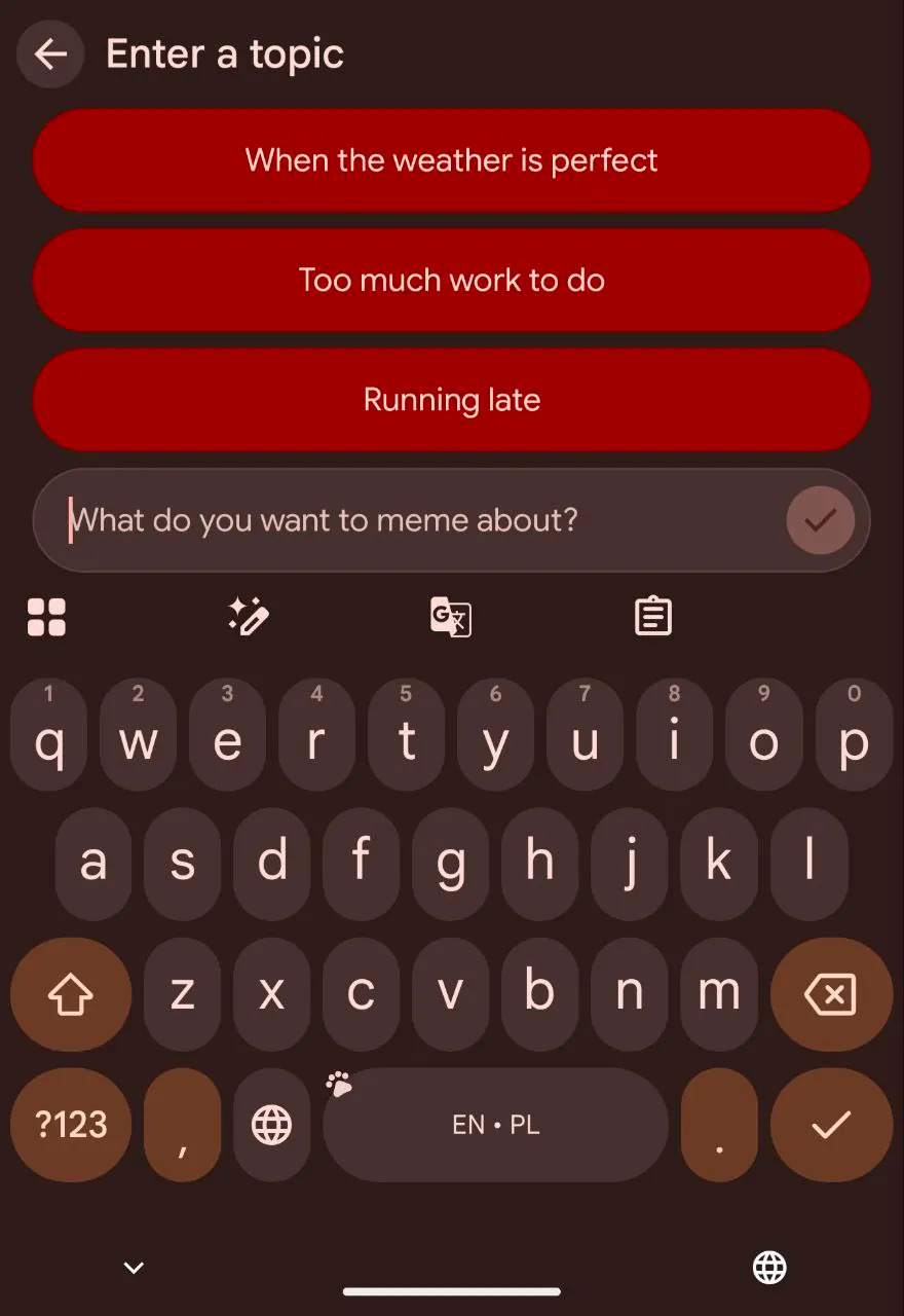 El segundo modo, mucho más ambicioso, es el de generación automática. Aquí, el usuario introduce un tema o elige entre varias sugerencias, y la inteligencia artificial selecciona tanto la imagen base como el texto del meme. Este proceso se realiza en los servidores de Google y requiere conexión a internet.