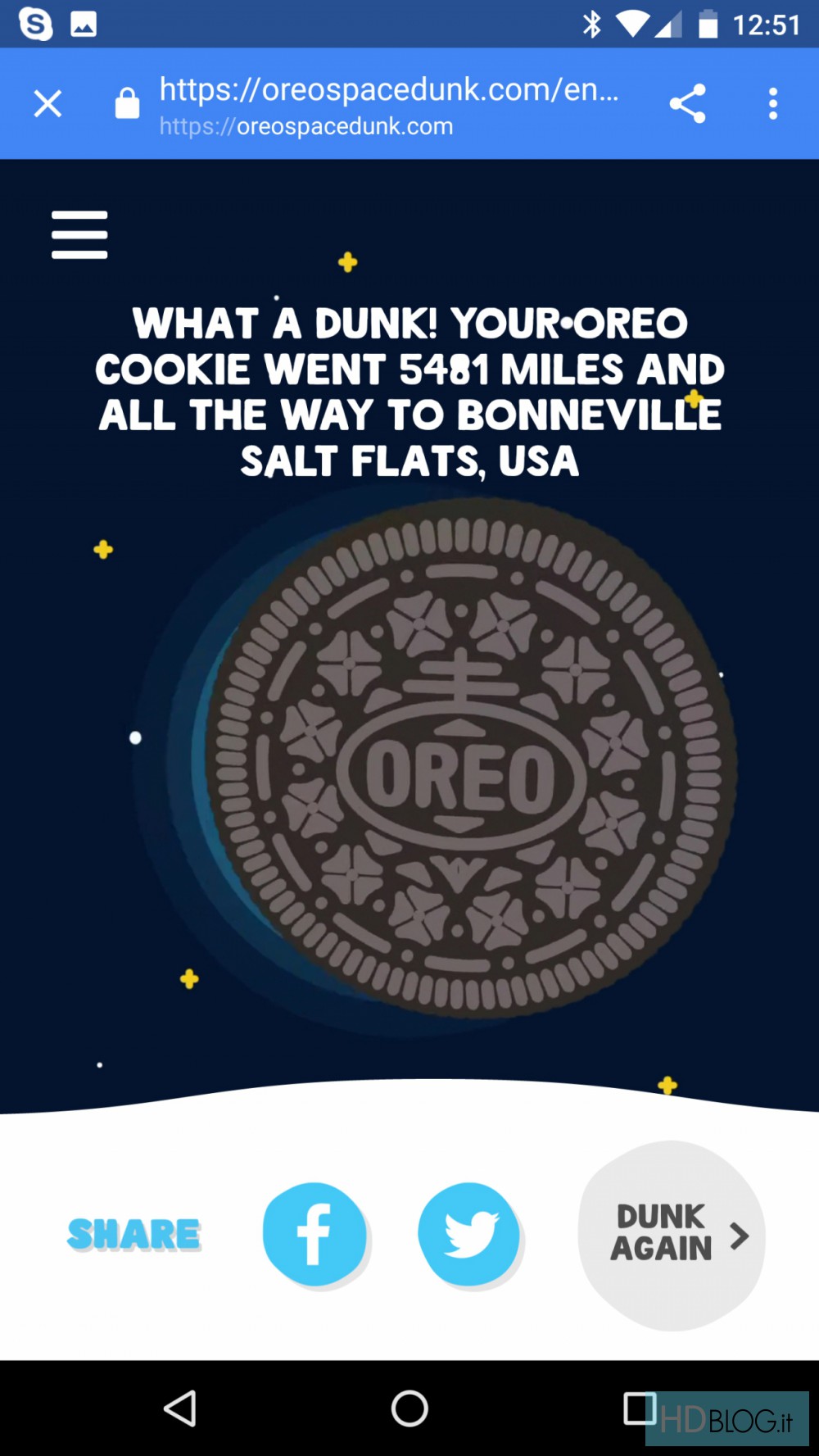 El objetivo de este juego es «lanzar» una galleta Oreo al espacio para caer en un vaso de leche remoto, y para ello debemos agitar con todas nuestras fuerzas el smartphone. El uso de imágenes de satélite de Google que se inician justo en el lugar donde estamos hace que el lanzamiento sea espectacular, y la galleta acaba cayendo en otra zona del mundo.