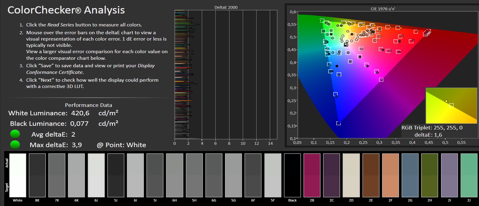 La reproducción de los colores es ahora mucho más acertada, ya que el error medio ha pasado de 6.9 dE a tan solo 2 dE. Como referencia, un valor por debajo de 4 dE se considera excelente y por encima de 9 dE se considera inaceptable.
