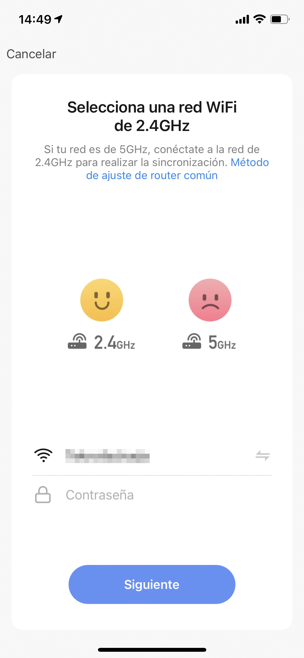 Una vez que has elegido el dispositivo y, asumiendo que se conecta por WiFi, la app te pedirá que proporciones el nombre y clave de tu red WiFi para que la app se las pase a tu dispositivo. Es importante que sea una red de 2.4GHz ya que la mayoría de los dispositivos inteligentes usa esta frecuencia, ya que tiene más alcance que la de 5GHz.