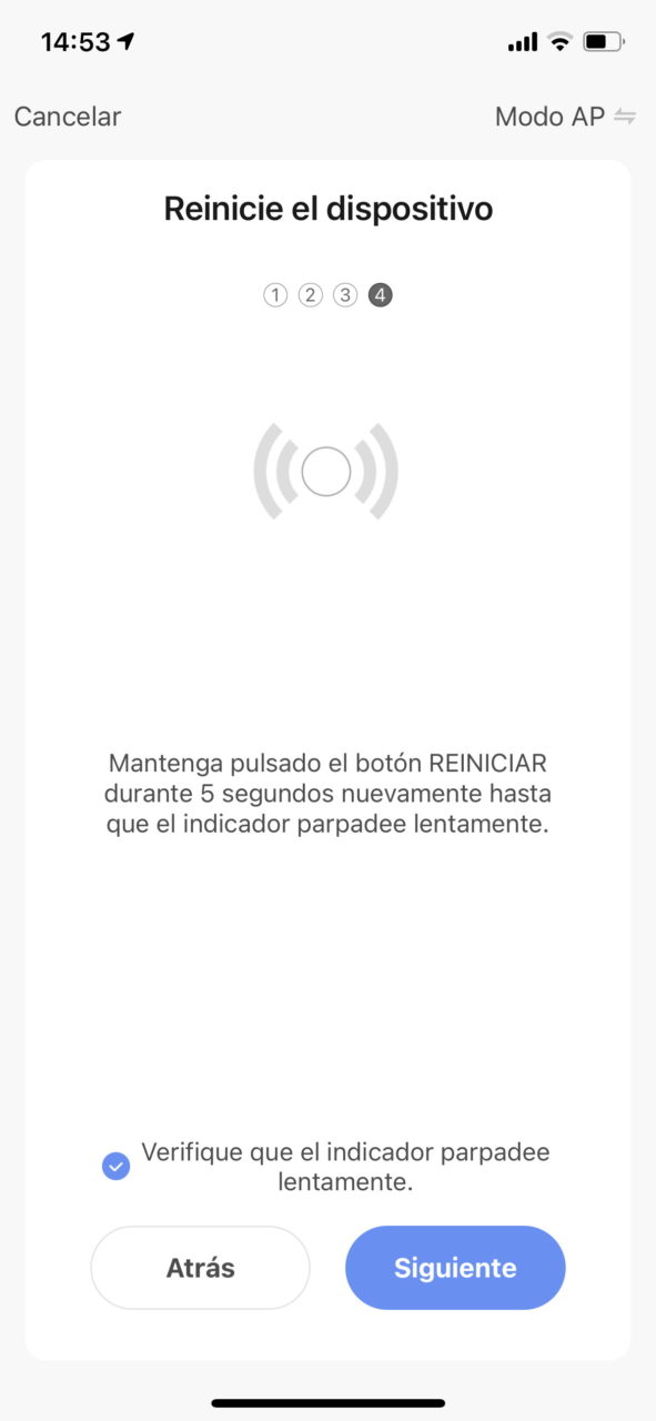 El siguiente paso es conectar el móvil con el dispositivo inteligente. Todos los dispositivos tienen dos formas de conexión: modo EZ y modo AP. Nunca — repito, nunca — he conseguido conectar un dispositivo usando el modo EZ, que es el primero que aparece por defecto, sino que he tenido que recurrir al modo AP.
