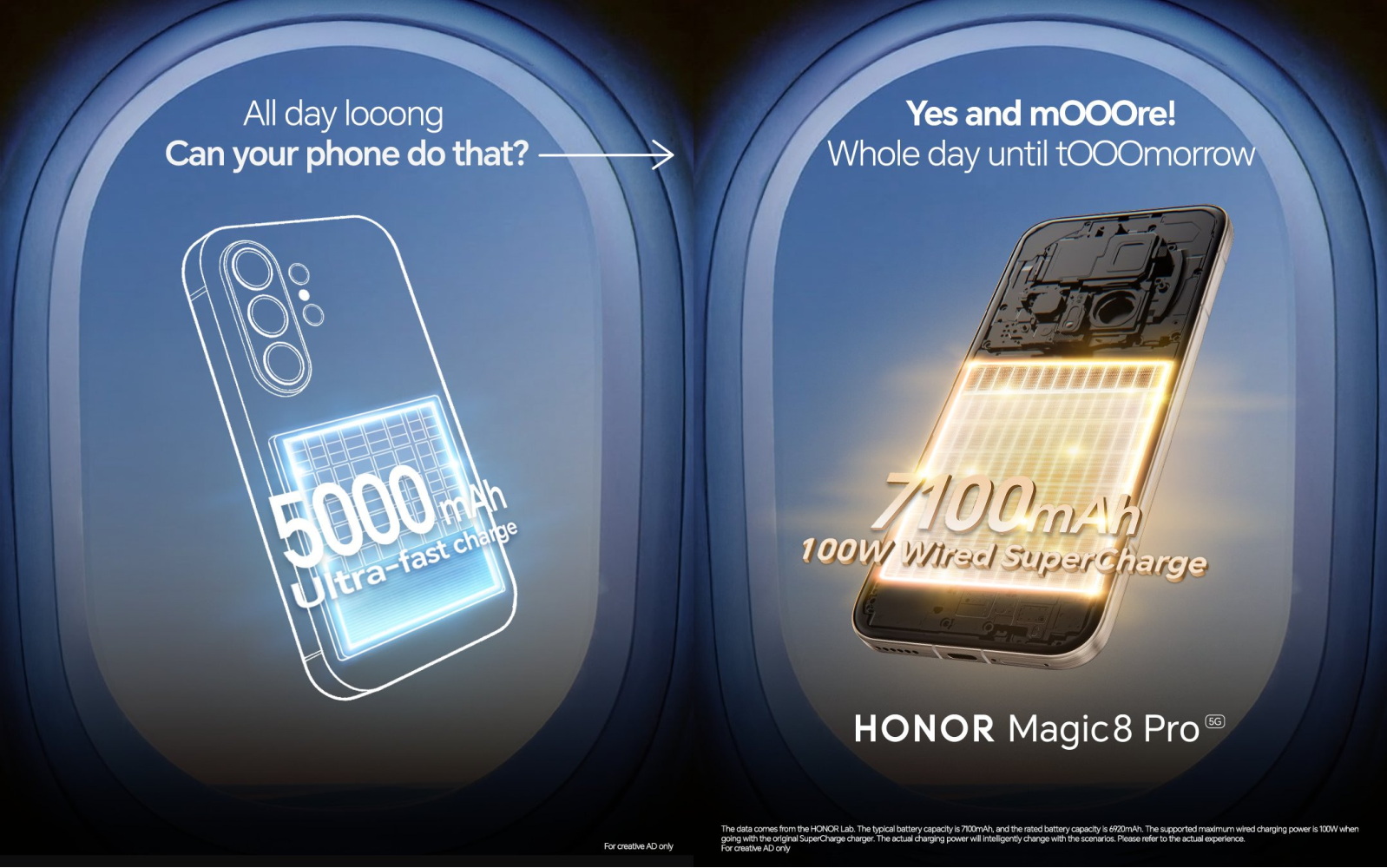 La segunda imagen muestra el HONOR Magic 8 Pro, que según la compañía incorpora una batería considerablemente mayor, de 7.100 mAh, acompañada de tecnología de carga rápida por cable de 100 W.