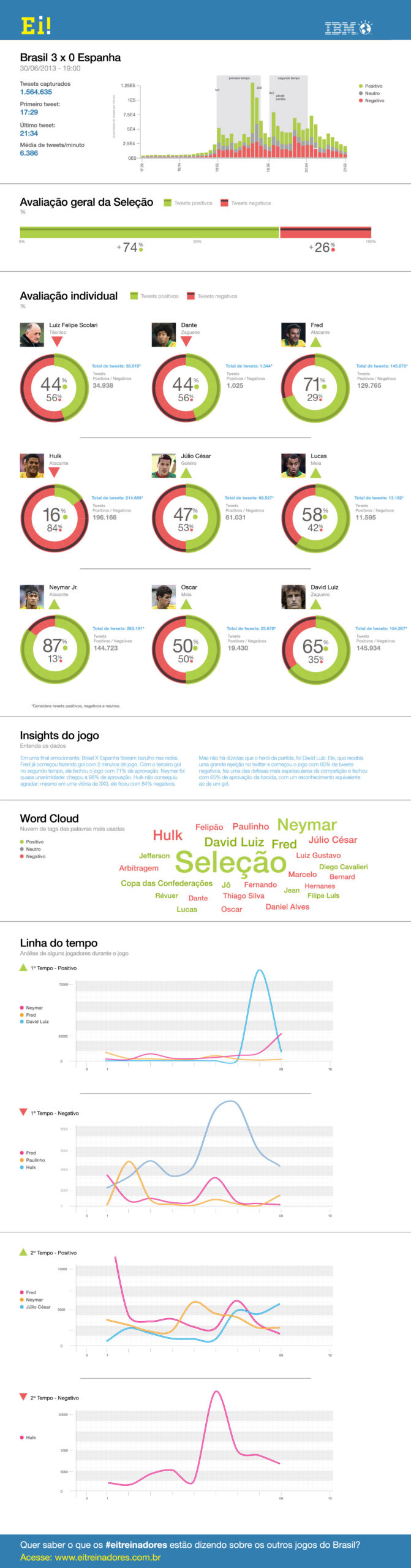 Neymar fue formidable, con un 87% de opiniones favorables en twitter mientras que Hulk no acaparó buenas críticas a pesar de ser el más nombrado en Twitter. En total IBM capturó 1,5 millones de tweets y el período de máxima actividad fueron los últimos minutos de la primera parte.