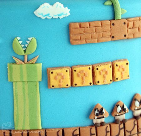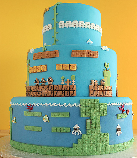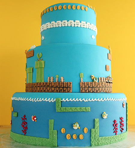En la tarta podemos apreciar diversos niveles del juego, incluyendo el nivel 1-1, niveles de aire y niveles bajo agua. ¿Por cuál empezarías a comértelo tú? | Fuente: Toxel
