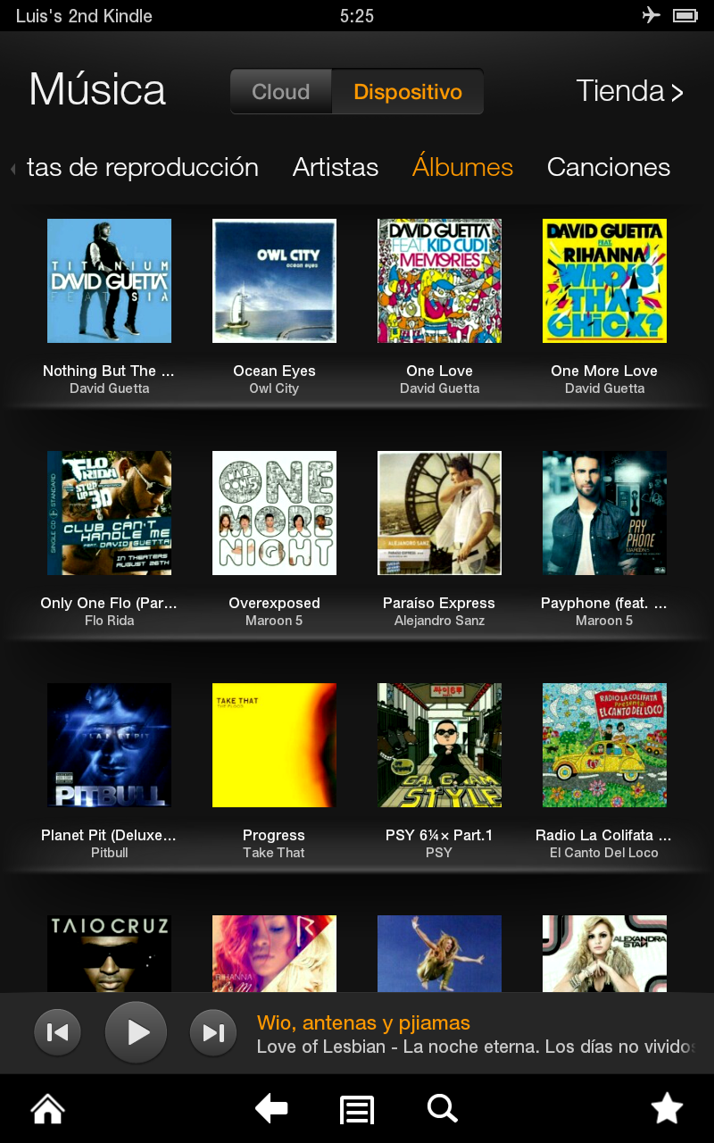 - Las pestañas Juegos, Aplicaciones, Libros, y Música nos llevan a páginas donde podemos ver el contenido disponible en el Kindle referente a dichos apartados, así como al contenido digital que hemos comprado en la tienda Amazon y que podemos descargar al dispositivo en cualquier momento. También nos da la posibilidad de acceder la Tienda para adquirir nuevo contenido digital.