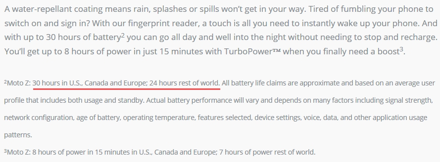 Curiosamente, la letra pequeña dice la batería del Moto Z dura 30 horas «en Estados Unidos, Canadá y Europa», pero solo 24 horas en el resto del Mundo.
