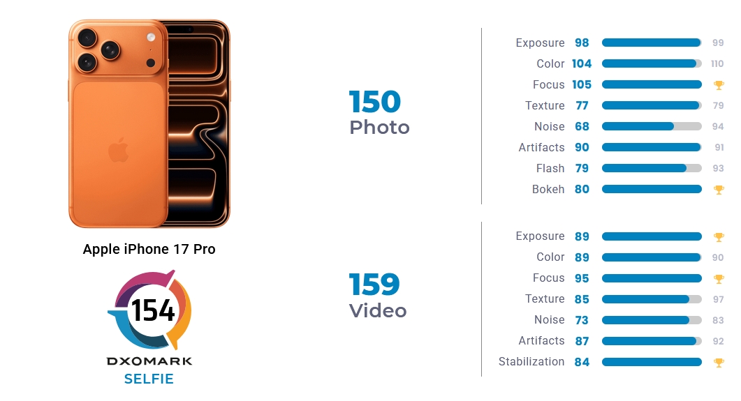 En el análisis de DxOMark, el iPhone 17 Pro alcanza 154 puntos y se coloca en lo más alto de la clasificación de cámaras frontales. Por detrás quedan el iPhone 16 Pro y el Honor Magic6 Pro con 151 puntos, seguidos por el iPhone 15 Pro con 149 puntos y el Google Pixel 9 Pro XL con 148 puntos.