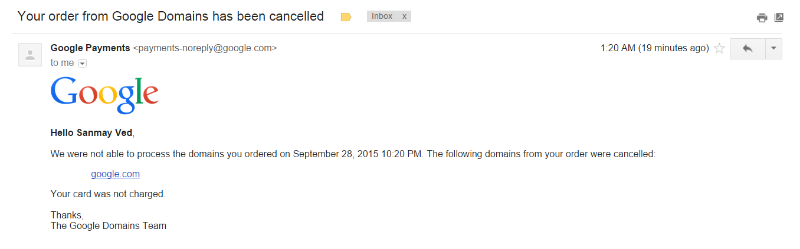 Esta es una de las historias más extrañas que hemos leído en Internet desde hace mucho tiempo. Trata de cómo un hombre llamado Sanmay Ved fue capaz de utilizar el servicio de compra de dominios de Google para comprar el propio dominio de la compañía, Google.com, por 12 dólares el pasado 29 de septiembre.