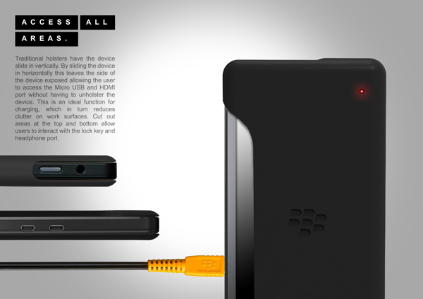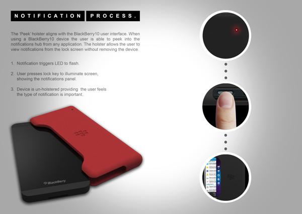 Desgraciadamente, cuando nuestro teléfono BlackBerry está dentro de una funda, el LED de notificación puede acabar escondido, y por eso este diseño conceptual de la funda Peek Case realizado por Steve Purvey, un estudiante en prácticas de BlackBerry, está muy bien pensado.
