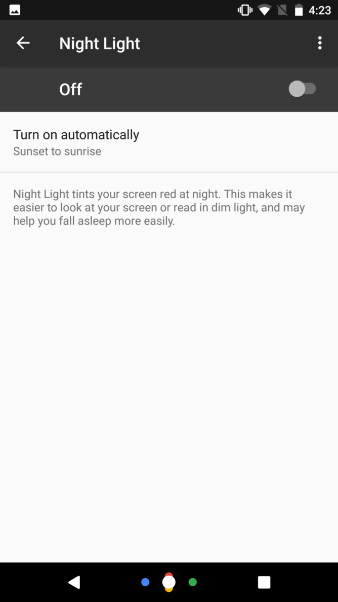 El modo Luz Nocturna aparecía como Modo Noche en algunas versiones preliminares de Android 7, pero fue posteriormente eliminado ya que según la compañía no funcionaba tan bien como esperaban. Ahora parece que Google ha solucionado los problemas e incluso será posible activarla automáticamente siguiendo un determinado horario o utilizando la información de a qué hora sale y se pone en Sol.