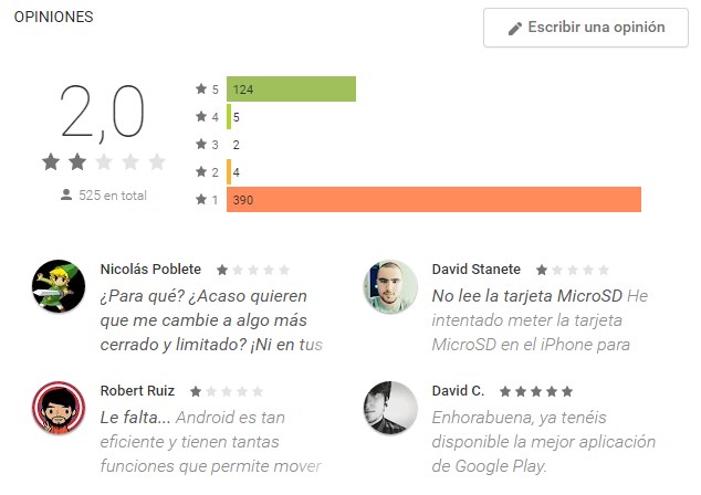 La aplicación está recibiendo un montón de malas puntuaciones en Play Store y, por los comentarios, parece estas críticas no se deben a la aplicación en sí sino al sentimiento de rechazo que genera entre muchos usuarios que Apple simplifique el proceso de migración a su plataforma .