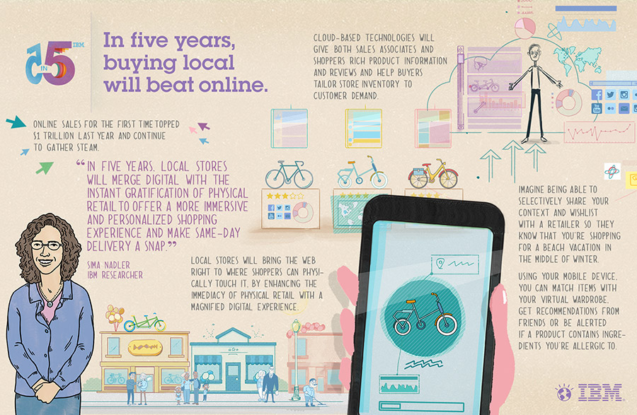 Sin embargo, en cinco años las innovaciones harán posible que comprar en las tiendas físicas vuelva a estar de moda. Los comerciantes más inteligentes utilizarán la proximidad con los clientes para crear experiencias que no pueden ser replicadas por las tiendas exclusivamente online. Así, estos se beneficiarán de las nuevas experiencias digitales que sus clientes experimentarán en la tienda física, una posibilidad que hasta ahora solo se podía producir en Internet.