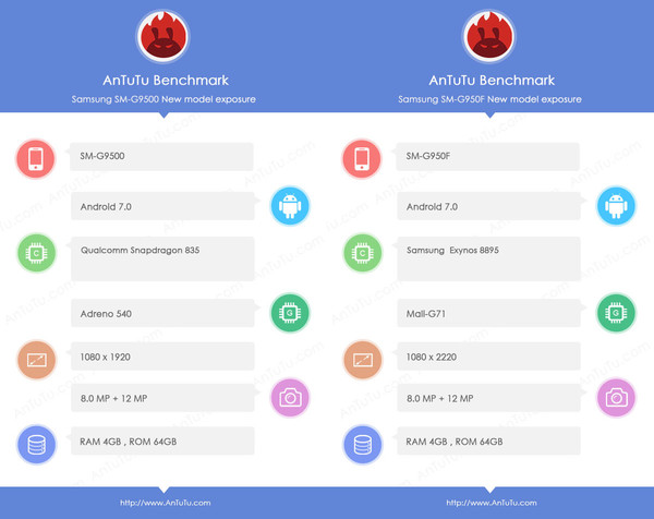 El modelo SM-G950F será probablemente la versión internacional, y llega con Exynos 8895, GPU Mali-G71, 4GB de RAM, 64Gb de almacenamiento y cámaras de 12MP/8MP. El modelo SM-G955F podría ser la variante internacional del Samsung Galaxy S8+ y cuenta con las mismas especificaciones que el Galaxy S8.