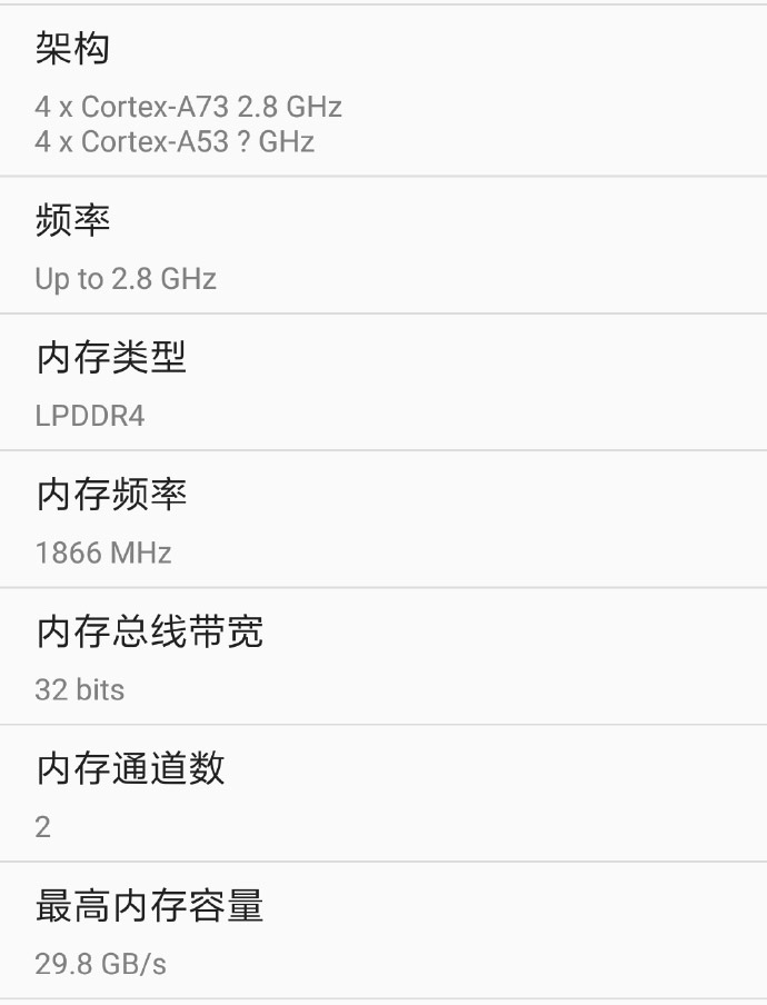 La captura de pantalla revela que el Kirn 970 llegará con CPU de ocho núcleos, cuatro de ellos Cortex-A73 a 2.8GHz y otros cuatro Cortex-A53 a una frecuencia sin determinar. La memoria LPDDR4 correrá a 1866MHz, mientras que la GPU será Mali-G72 MP8.