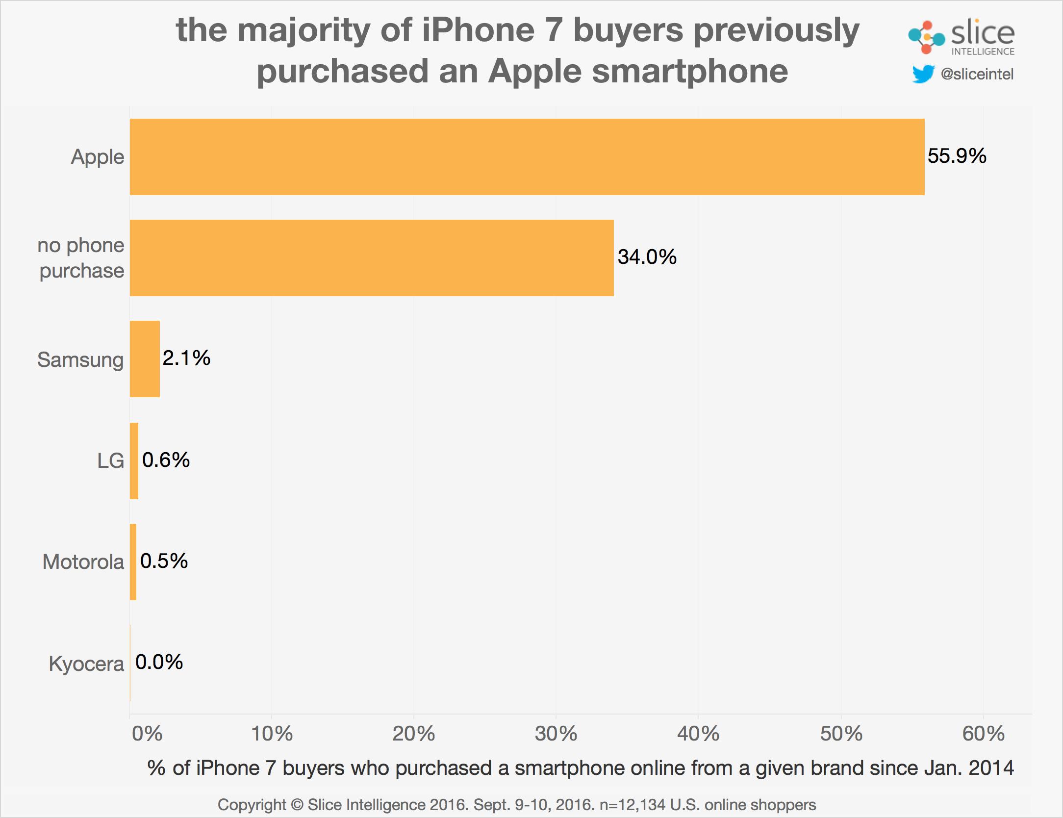 Según Slice Intelligence, un 56% de los clientes que han reservado un iPhone 7 / iPhone 7 Plus, habían comprado un iPhone entre 2014 y hoy. El 34% son nuevos compradores o tenían un iPhone más antiguo, mientras que el resto provienen de Android.