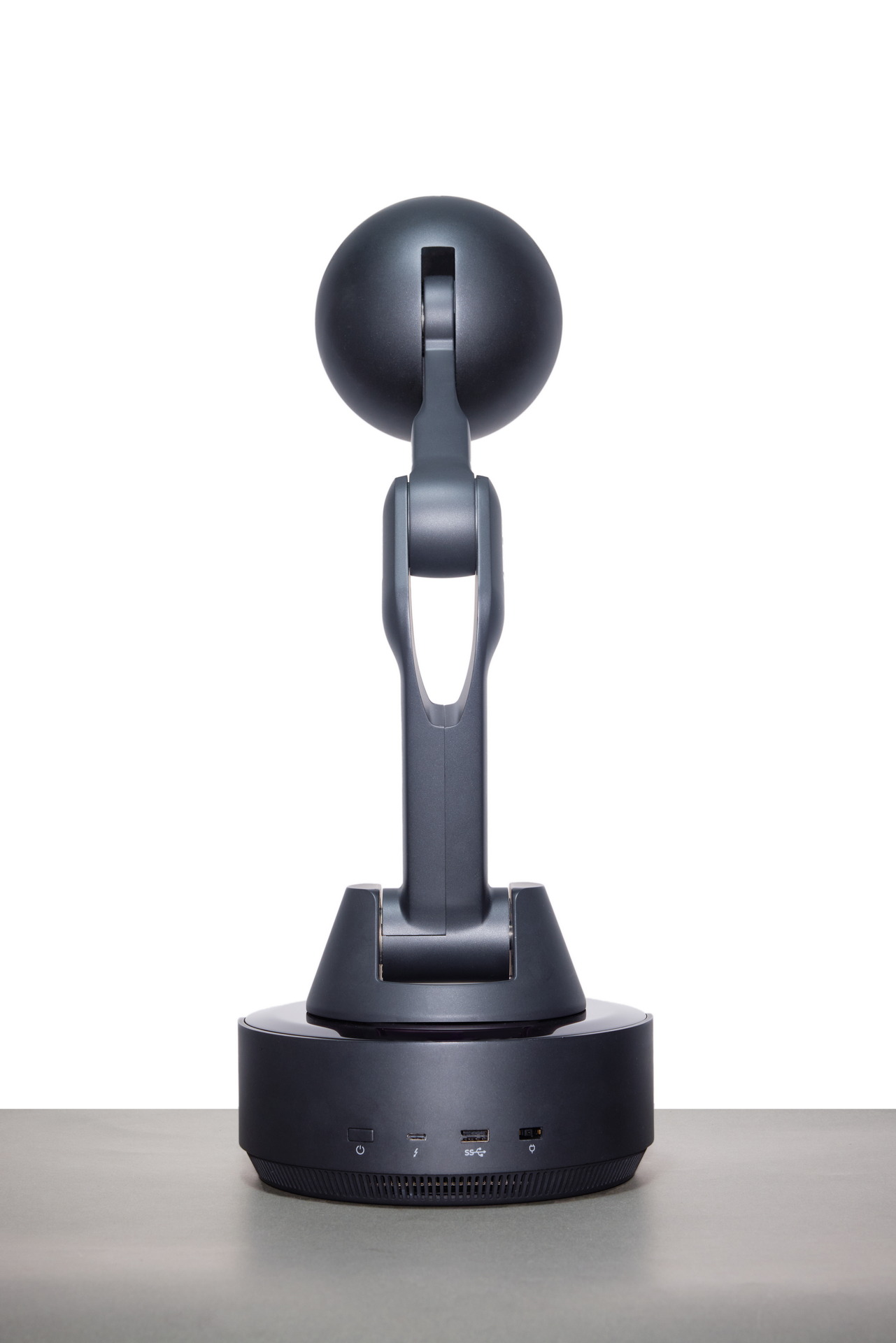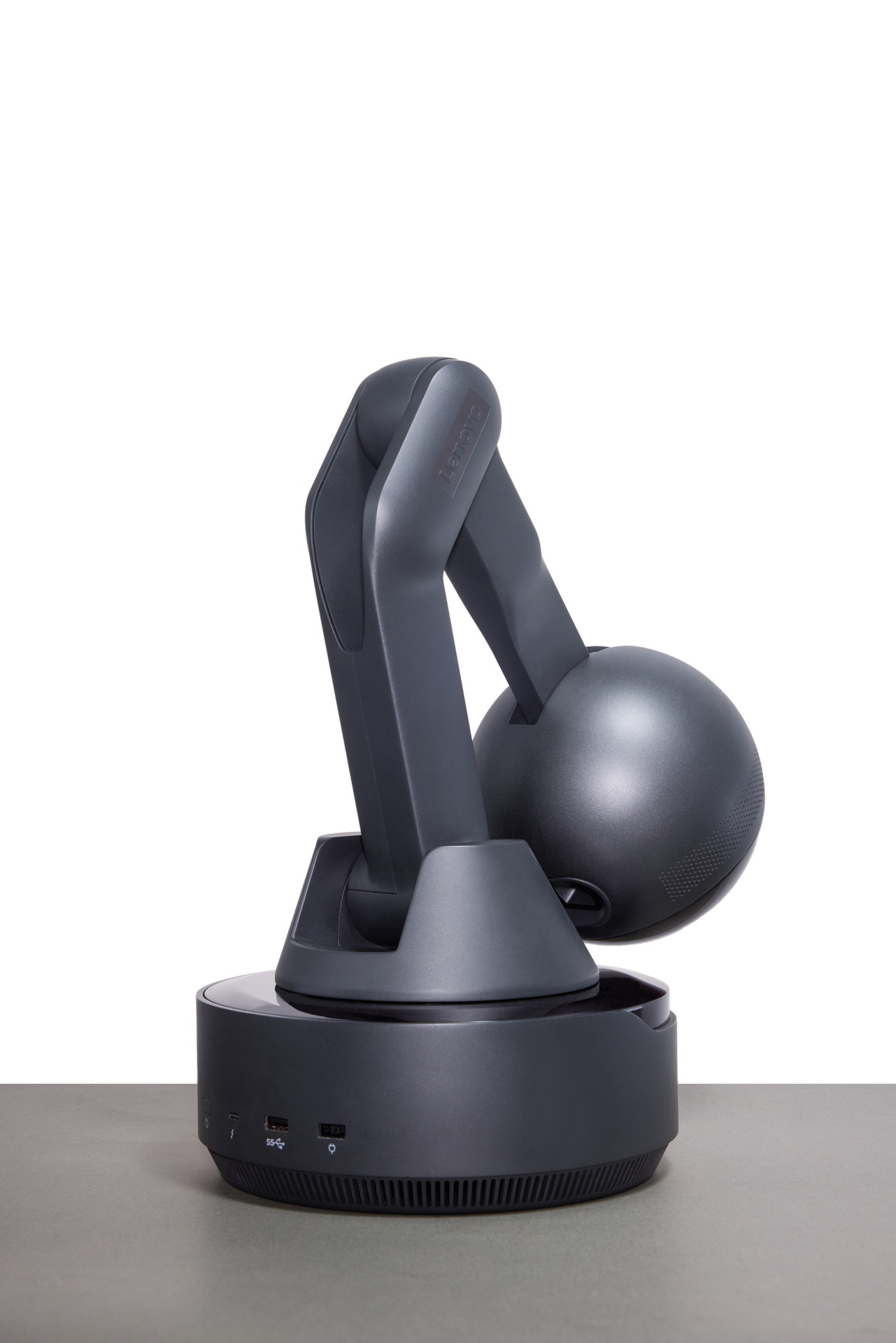 Lenovo dispositivo tecnológico moderno con diseño innovador en color negro, fondo blanco minimalista.