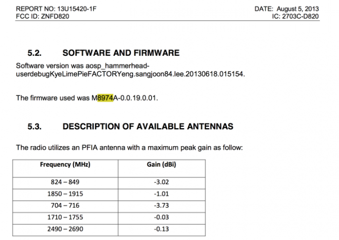 El firmware del dispositivo es M8974A, lo cual apunta a que posee un procesador Snapdragon 800. La versión de software del dispositivo es “aosp_hammerhead-userdebugKeyLimePieFACTORYeng.sangjoon84.lee.20130618.015154.” El prefijo «aosp_» también nos indica que se trata de un dispositivo Nexus, y el término «KeyLimePie» indica que correrá Android 4.4.