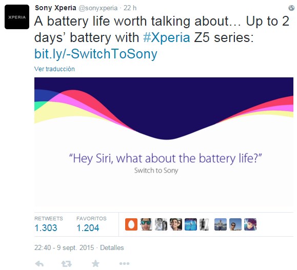 En un tweet publicado por Sony, la compañía destaca la autonomía de los nuevos Xperia Z5 frente a la de los nuevos teléfonos de Apple, pidiendo a Siri que responda sobre la duración de la batería de los iPhones. Puestos a lanzar preguntas, también podríamos preguntar a Sony por la llegada de Lollipop a sus terminales 🙂