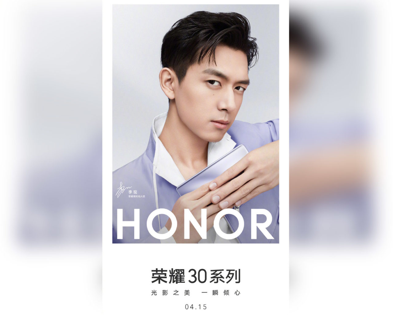 El embajador de la marca es el popular actor chino Li Xian, y para el póster promocional ha posado con el teléfono, ocultando casi toda la parte de atrás y dejando ver únicamente su color plateado-morado.