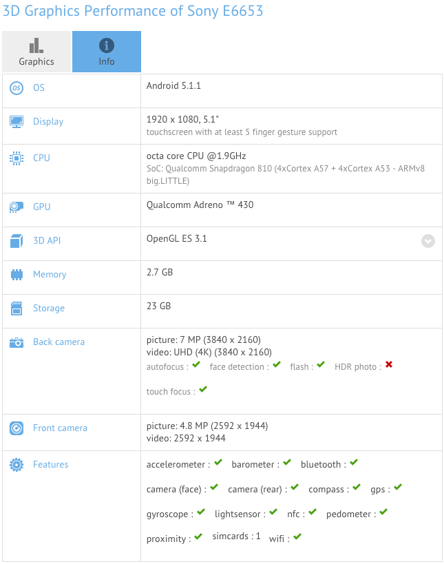 El Sony Xperia Z5 (E6653) y el Sony Xperia Z5 Compact (E5823) han sido vistos en la web de GFXBenchmark mostrando todas sus características antes de su anuncio oficial, que tendrá lugar mañana.