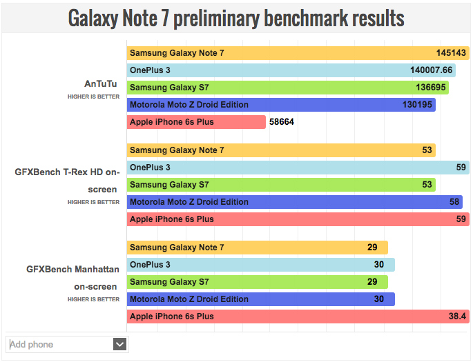 Sin embargo, en los benchmarks de GFX, el Galaxy Note 7 solo llega a la puntuación obtenida por el Galaxy S7. El nuevo Moto Z vence a ambos terminales, y el iPhone 6s Plus es el vencedor absoluto. El OnePlus 3 también obtiene una puntuación bastante impresionante.