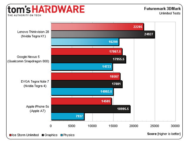 Según los chicos de Tom’s Hardware, el nuevo procesador Tegra K1 que combina CPUs ARM Cortex-A15 con una GPU basada en la misma arquitectura Kepler que encontramos en PCs bate por más de un 25 por ciento a los procesadores más potentes del momento, incluyendo el Snapdragon 800 de Qualcomm y al A7 de Apple, en el test 3DMark.