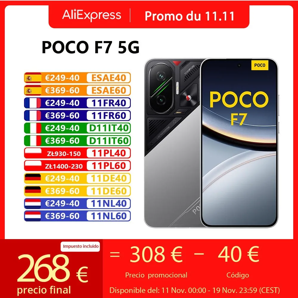 | POCO F7 5G | 302,31 | 40 | 262,31 € | BFES40, ESBF40 o TEKNOE40 | ![]() |