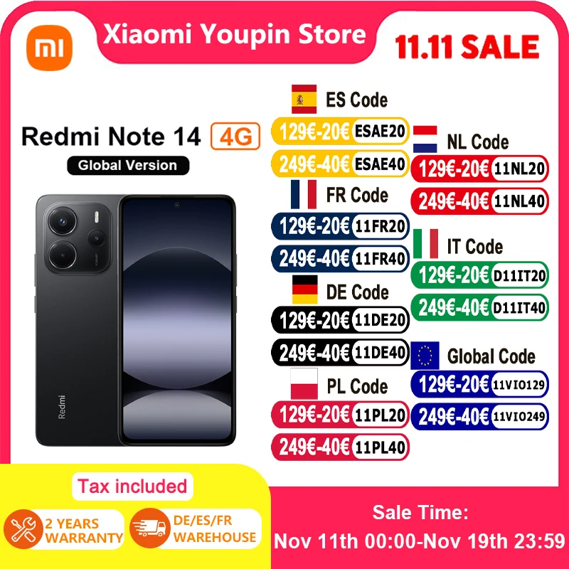 | Xiaomi Redmi Note 14 4G | 141,08 | 20 | 121,08 € | BFES20 o, ESBF20 o TEKNOE20 | ![]() |