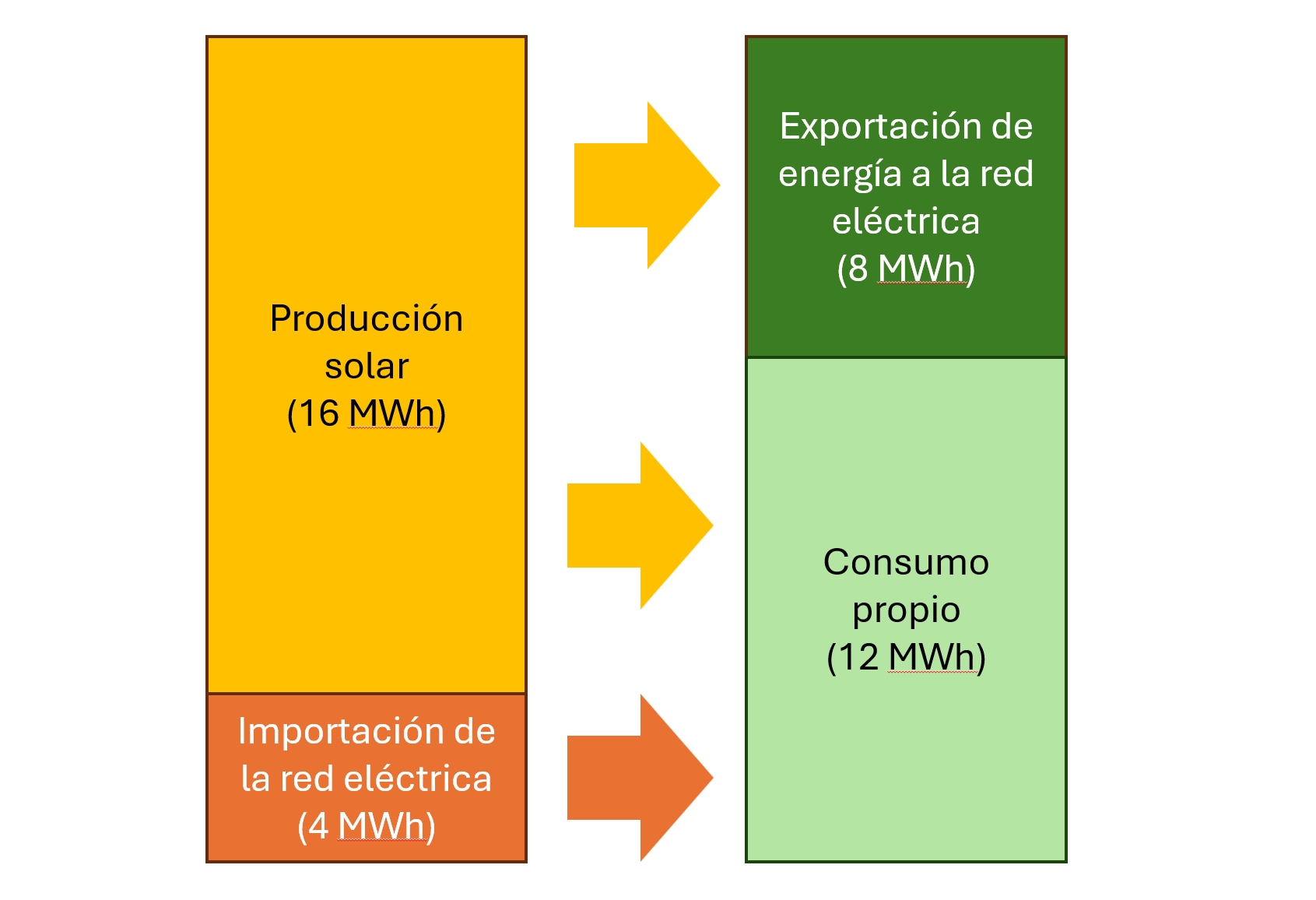 En mi casa, la producción solar en los últimos 12 meses ha sido de 16 MWh y se han importado 4,1 MWh de la red eléctrica. De los 20,1 MWh totales (generados por las placas más importados de la red eléctrica), se han vertido a la red 7.8 MWh y se han usado 12,1 MWh para consumo propio.