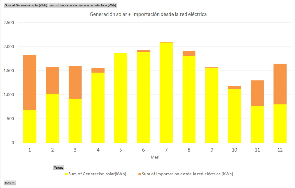 En esta gráfica se puede ver la evolución mensual de la generación de energía por placas solares (amarillo) + importación de energía de la red eléctrica (naranja).