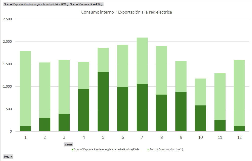 En esta gráfica se puede ver la evolución mensual del consumo en el hogar (verde claro) + exportación a la red eléctrica (verde oscuro).