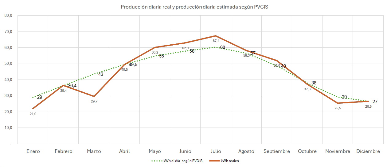 Si tienes curiosidad por saber cómo compara la producción real con la producción estimada con la herramienta PVGIS, en esta gráfica se ha representado en línea verde discontinua. Como se puede apreciar, la estimación que se consigue con la herramienta es bastante acertada.