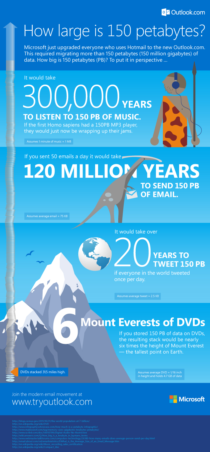 El proceso de migración ha requerido la transferencia de 150 petabytes (150.000.000 gigabytes) de datos y ha llevado unas seis semanas. Como no es fácil imaginarse cuánto son 150 petabytes, Microsoft ha preparado una infografía donde lo muestra visualmente. Pulsa sobre ella para verla a tamaño grande.