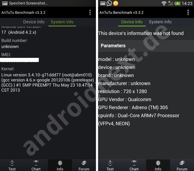 Por el momento sabemos que llegaría con una cámara UltraPixel de 4 megapíxeles similar a la del HTC One, así como una cámara frontal de 1,6 megapíxeles. Contaría con una pantalla de 4,3″ con resolución 1280 x 720 y en su interior posee un procesador de dos núcleos Snapdragon 400 a 1,4 GHz con una GPU Adreno 305 y 1 GB de RAM.