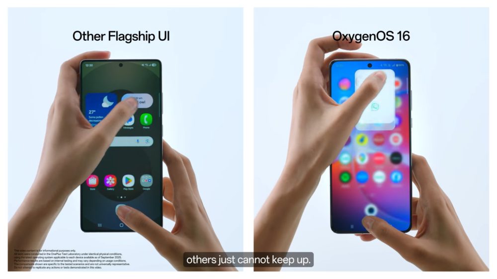 En un vídeo oficial compartido por OnePlus, se muestra una comparativa en pantalla dividida entre un smartphone con OxygenOS 16 y otro con One UI de Samsung (etiquetado en el vídeo como “Other Flagship UI”). En la demostración, el dispositivo de Samsung parece atascarse al cargar un juego, mientras que el de OnePlus cambia entre aplicaciones con fluidez.