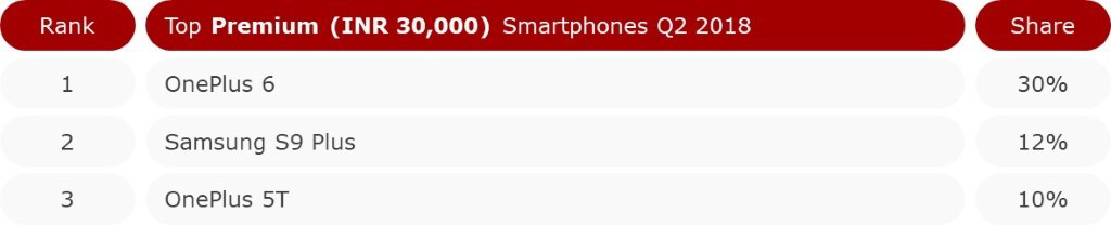 El OnePlus 6 fue el smartphone de gama alta más vendido, seguido por el Galaxy S9 Plus y el OnePlus 5T. Las ventas de este último modelo fueron potenciadas por OnePlus durante la primera mitad del trimestre para reducir inventario y dar paso a OnePlus 6.
