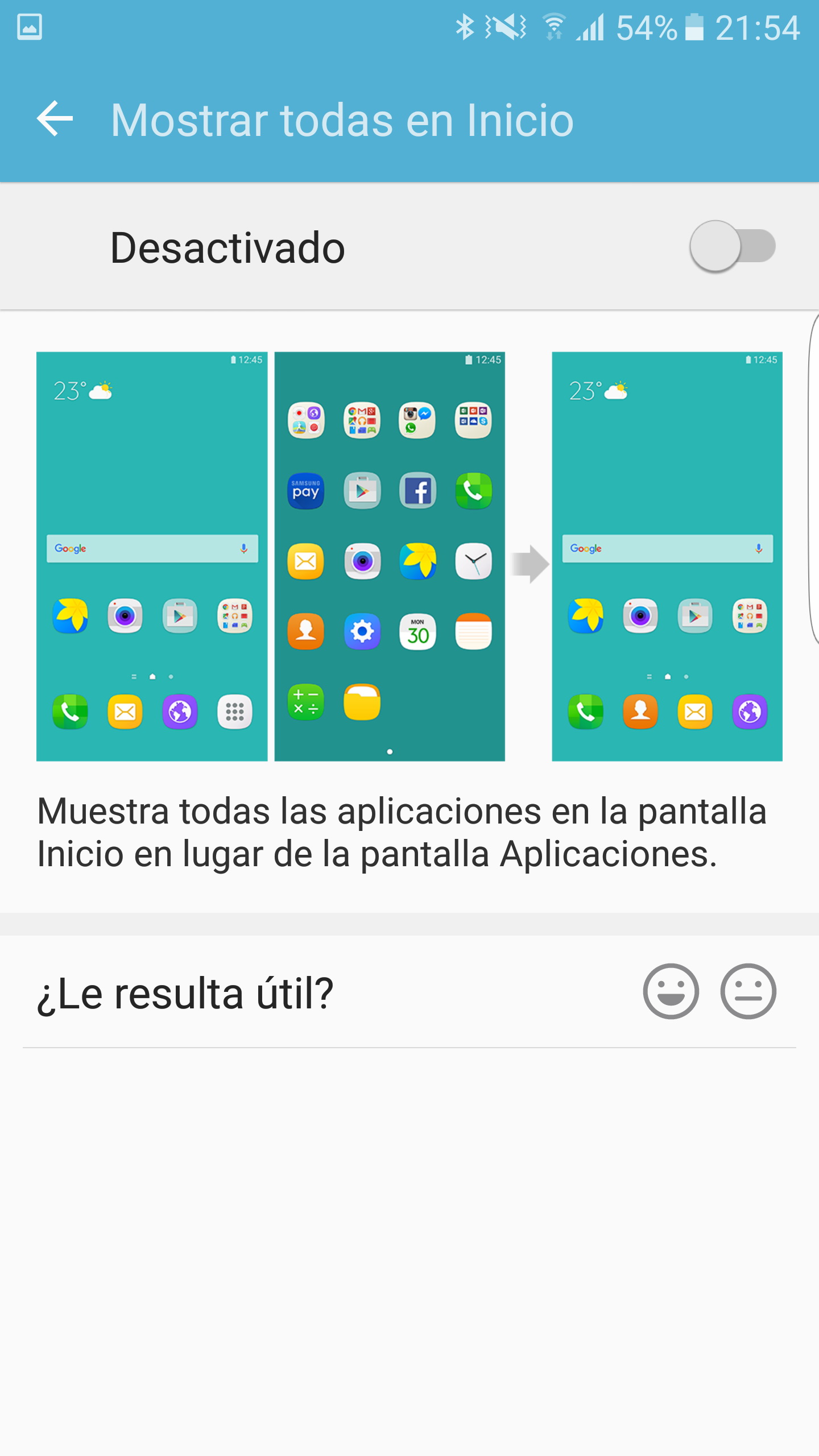 Al activar esta función, todas las aplicaciones se colocan en el escritorio en el orden en el que fueron instaladas. Si la desactivas, aparece un mensaje que te avisa de que se va a crear una pantalla separada, accesible mediante un icono, donde encontrarás fácilmente las aplicaciones instaladas.