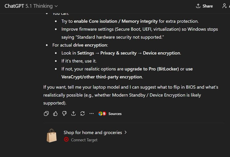 Todo comenzó cuando un usuario de ChatGPT Plus preguntó algo totalmente rutinario sobre Windows BitLocker, la función de cifrado de unidades de Microsoft. La respuesta del modelo de IA fue correcta desde el punto de vista técnico, pero junto al texto apareció un llamativo recuadro con el mensaje “Shop for home and groceries” y el logotipo de Target, una conocida cadena de tiendas en Estados Unidos.