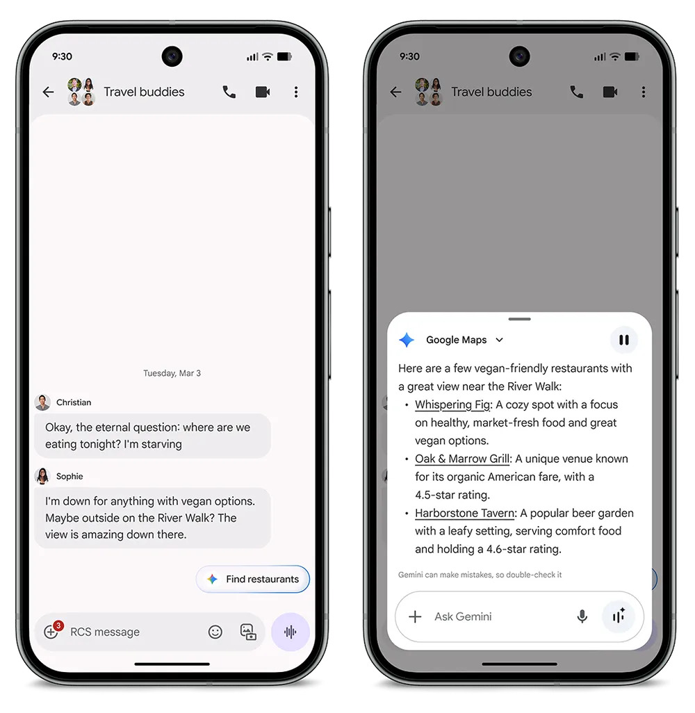 Encontrar restaurante cuando estás organizando planes por chat es ahora más sencillo. Magic Cue detecta conversaciones relacionadas con dónde comer y propone utilizar Gemini para generar recomendaciones.