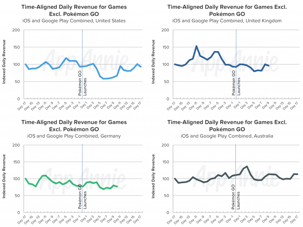 Otros juegos como Mobile Strike, Clash of Clans y Candy Crush Saga no han experimentado un descenso en sus ingresos diarios. «Pokémon GO no ha tenido un impacto sustancial ni sostenido en los ingresos diarios de otros juegos de iOS y Google Play.»