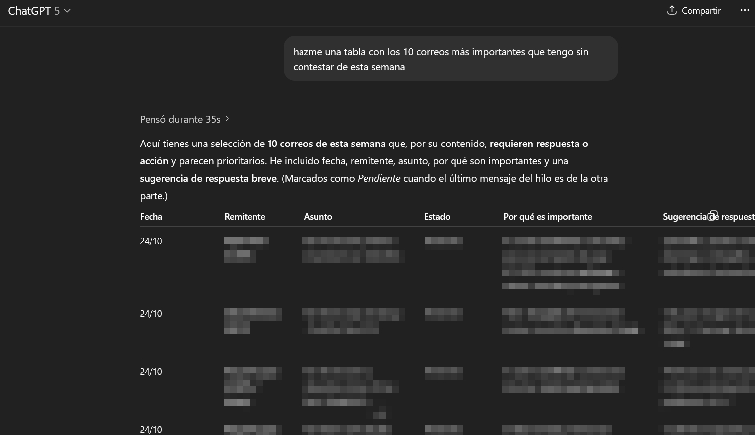 - Contextualizar conversaciones: si estás trabajando en un hilo de correo largo, ChatGPT puede ayudarte a extraer los puntos clave sin tener que abrir cada mensaje.